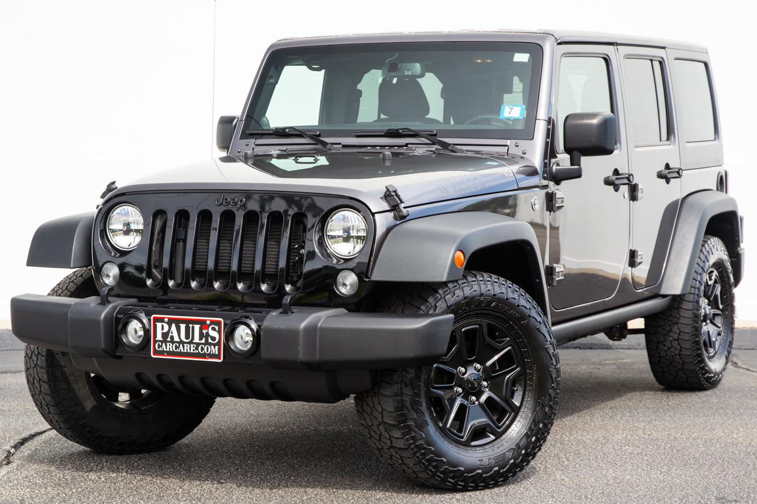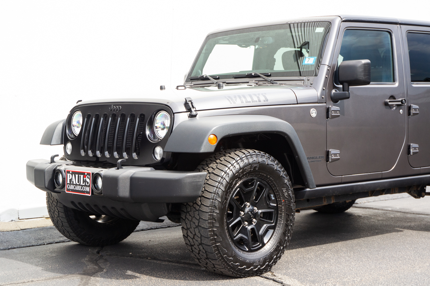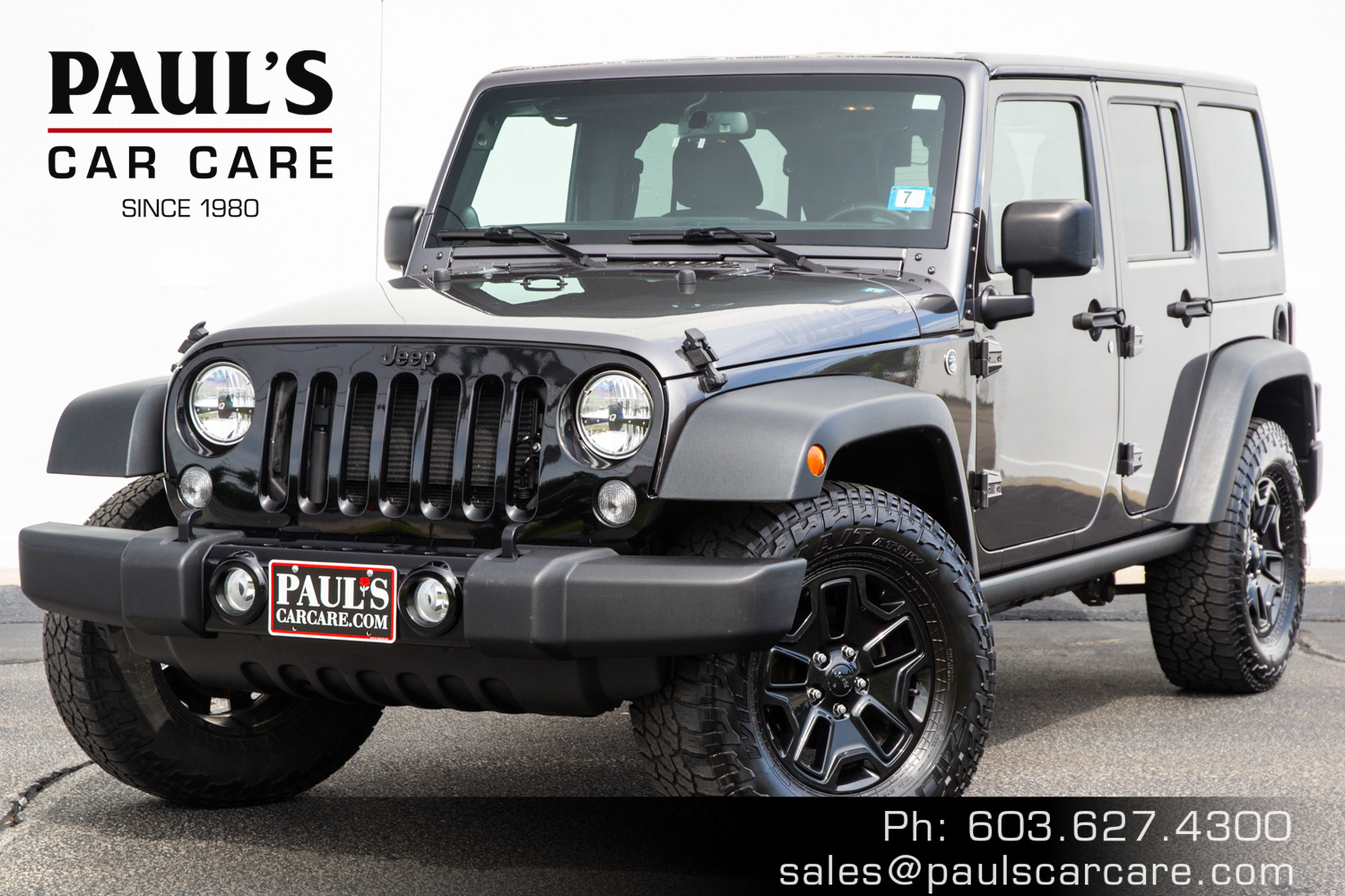 When it comes to all weather fun, Jeep's Wrangler unlimited provides the best of all worlds. Renown off-road capability, four wheel drive, convertible top and iconic styling, and this Willys Wheeler edition brings all the fun and ruggedness with an added angle of vintage style and modern amenities. The Willys Wheeler Trim adds, Willys Wheeler grill and decals, painted 17" Willys rims, off-road tires, rock rails, slush mats, power windows, power heated side mirrors, remote keyless entry, security alarm, leather wrapped steering wheel, rear passenger handles kit, sunscreen tint windows, satellite radio ($5,700) in addition to the Freedom Top ($2,185) and Automatic Transmission ($1,295); bringing the MSRP to $36,370. The vehicle has been fully inspected, detailed and is ready to go. Don't hesitate and give us a call today on this fantastic Jeep Wrangler Unlimited Willys Wheeler! (603) 627-4300 Vehicle Options: WILLYS WHEELER PACKAGE (Willys Wheeler grill and decals, painted 17" Willys rims, off-road tires, rock rails, slush mats, power windows, power heated side mirrors, remote keyless entry, security alarm, leather wrapped steering wheel, rear passenger handles kit, sunscreen tint windows, satellite radio - $5,700), Freedom Top ($2,185), Automatic Transmission ($1,295) -- MSRP $36,370 -- If you are interested in purchasing this vehicle, send an email to sales@paulscarcare.com, call 603-627-4300, or fill out our vehicle interest form.