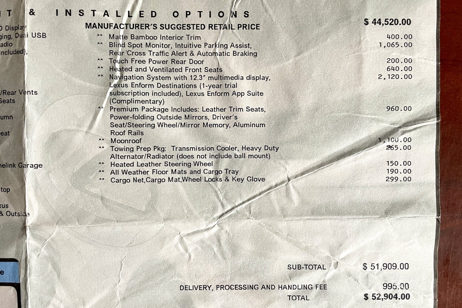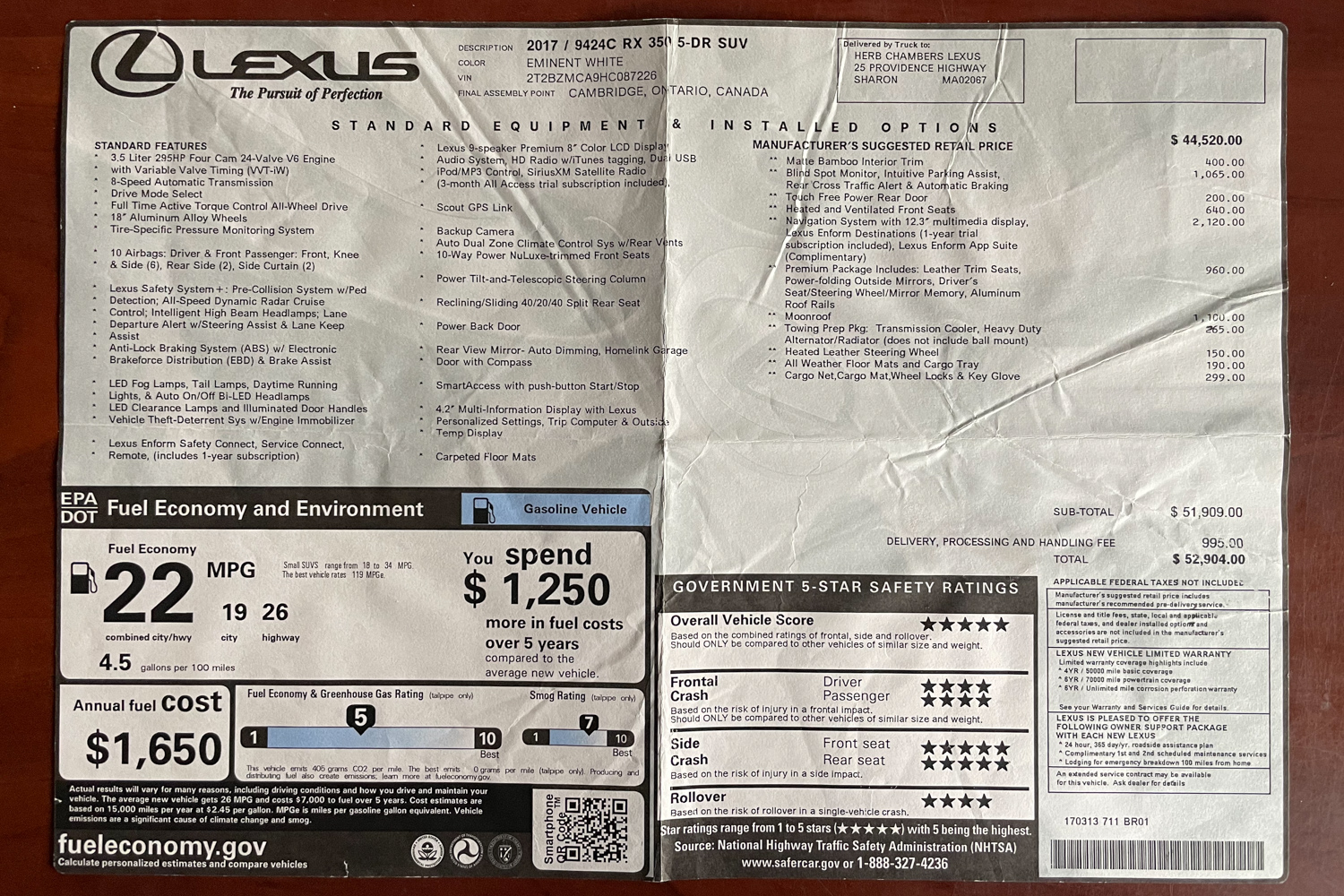 As the quintessential luxury SUV, Lexus's RX350 provides the all-weather security, safety, and comfort you need with the luxury, technology, and connectivity you deserve and this well cared for example falls right in line. Finished in a classic Eminent White over a supple Parchement Leather interior, this RX is in fantastic condition both inside and out. In addition to the fantastic standard features, this Lexus has been spec'd with an additional $7,600 in options including, PREIUM PACKAGE (Leather trim seats, power-folding outside mirrors, driver's side memory, and aluminum roof rails - $960), TOWING PREP PACKAGE (Transmission cooler, and heavy duty alternator/radiator - $265), Navigation system ($2,120), Moonroof ($1,100), Blind Spot monitor w/ Intuitive Parking Assist, Rear Cross Traffic Alert, and Automatic Braking ($1,065), Heated and Ventilated Seats ($640), Matte Bamboo Interior Trim ($400),PREIUM PACKAGE (Leather trim seats, power-folding outside mirrors, driver's side memory, and aluminum roof rails - $960), TOWING PREP PACKAGE (Transmission cooler, and heavy duty alternator/radiator - $265), Navigation system ($2,120), Moonroof ($1,100), Blind Spot monitor w/ Intuitive Parking Assist, Rear Cross Traffic Alert, and Automatic Braking ($1,065), Heated and Ventilated Seats ($640), Matte Bamboo Interior Trim ($400), Heated Leather Steering Wheel ($150), and much more, bringing the original MSRP to $52,904! Further the vehicle has been expertly maintained by the local Lexus dealership, and maintenance highlight include regular servicing along with the 40k service being completed. When it comes to Luxury SUVs, look no further than this stunning, well cared for, and extremely well equipped RX350 and call us today! (603) 627-4300 Vehicle Options: PREIUM PACKAGE (Leather trim seats, power-folding outside mirrors, driver's side memory, and aluminum roof rails - $960), TOWING PREP PACKAGE (Transmission cooler, and heavy duty alternator/radiator - $265), Navigation system ($2,120), Moonroof ($1,100), Blind Spot monitor w/ Intuitive Parking Assist, Rear Cross Traffic Alert, and Automatic Braking ($1,065), Heated and Ventilated Seats ($640), Matte Bamboo Interior Trim ($400), Cargo Net, Cargo Mat, Wheel Locks, and Key Glove ($299), Touch Free Power Rear Door ($200), All Weather Mats ($190), Heated Leather Steering Wheel ($150) -- MSRP $52,904 -- If you are interested in purchasing this vehicle, send an email to sales@paulscarcare.com, call 603-627-4300, or fill out our vehicle interest form.
