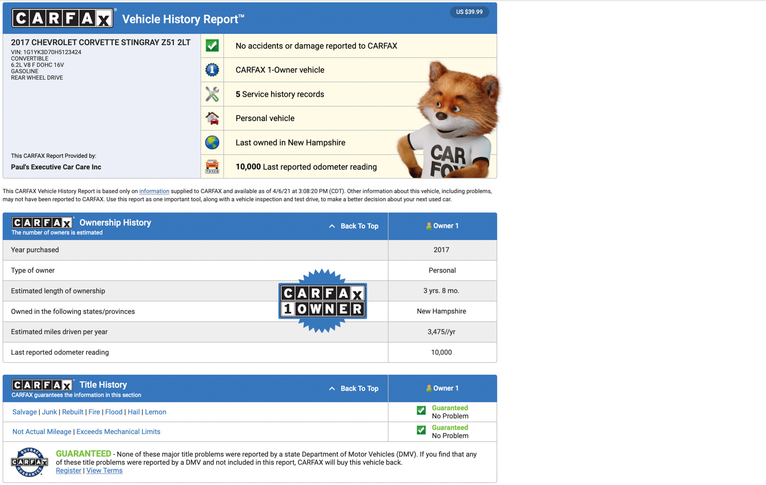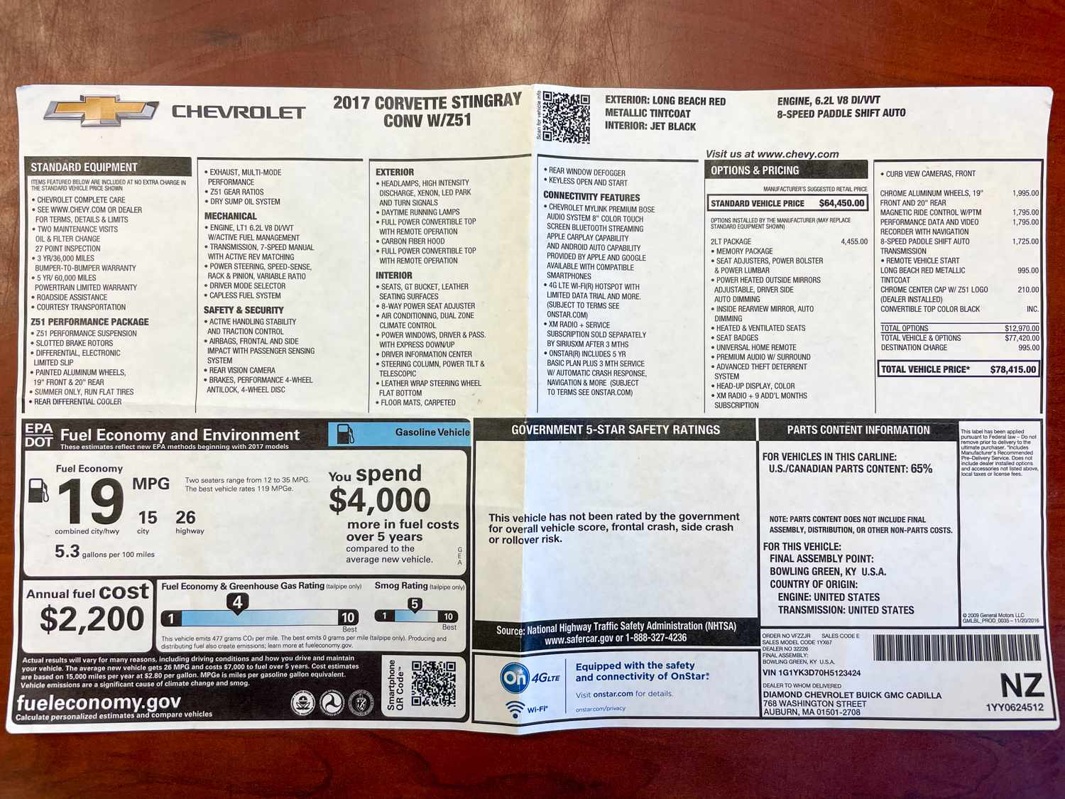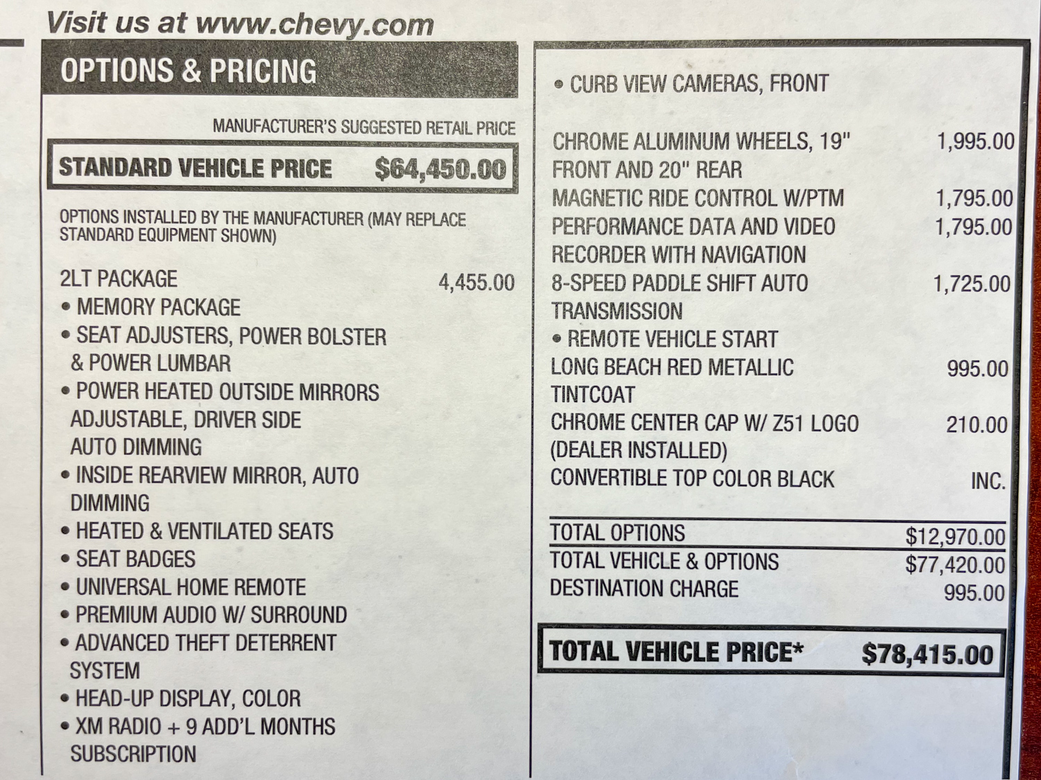 2LT PACKAGE (Memory package, seat adjusters w/ power bolster and power lumbar, power heated outside mirrors, auto-dimming rear view mirror, heated and ventilated seats, seat badges, universal home remote, premium audio w/ surround, advanced theft deterrent, head-up display, satellite radio - $4,455), Chrome Aluminum Rims ($1,995), Magnetic Ride Control ($1,795), Performance Data and Video Recorder ($1,795), 8-speed Automatic Transmission w/ remote start ($1,725), Long Beach Red Metallic ($995), Chrome Center Cap w/ Z51 Logo ($210) -- MSRP $78,415 -- If you are interested in purchasing this vehicle, send an email to sales@paulscarcare.com, call 603-627-4300, or fill out our vehicle interest form.