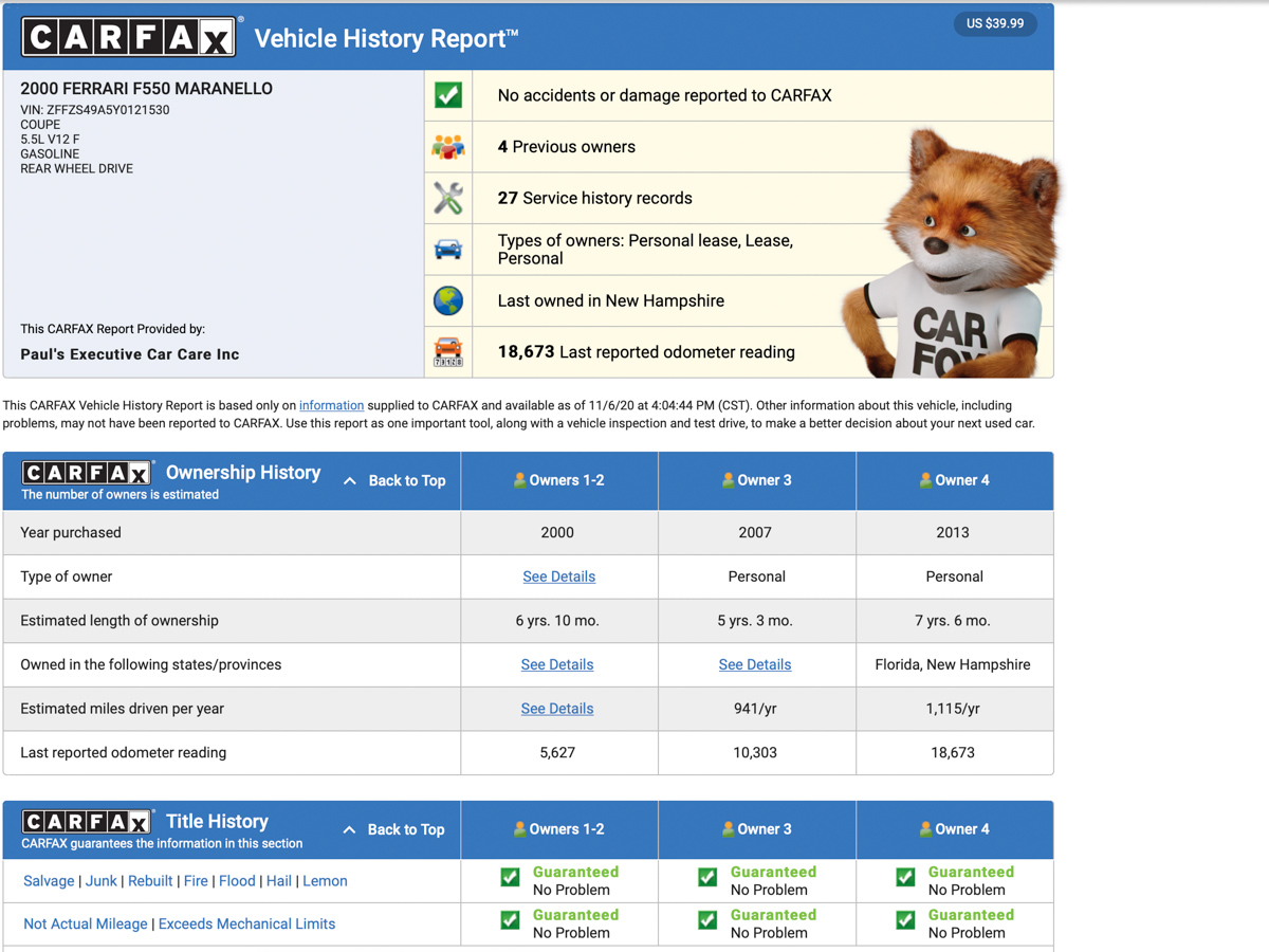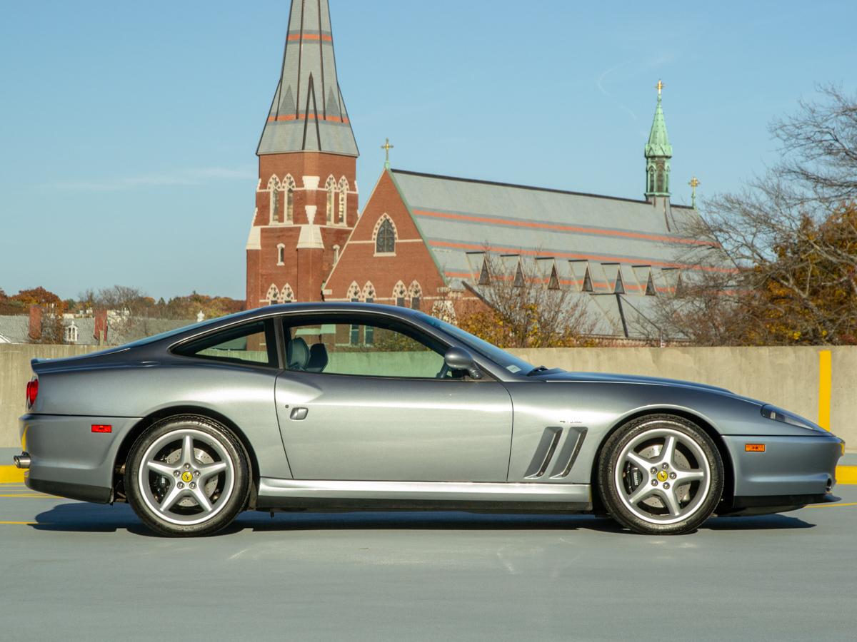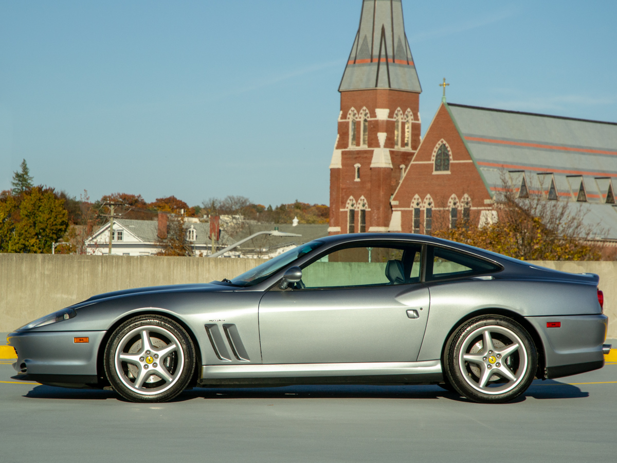 Ferrari's 550 Maranello wonderfully blends the classic Ferrari Layout of a front engined, rear wheel drive V12 two seater with a visceral grand touring driving experience you'd expect from a vehicle of this caliber. This stunning 550 is finished in a sharp Grigio Titanio over a Blue Scuro Leather and the vehicle is in excellent condition both inside and out. The vehicle has been owned by the most recent owner since 2014 and is a very complete car with both keys, all books, tool kit, and Ferrari cover. Mechanically, the vehicle has been expertly maintained by both the dealer as well as local European specialists, Precision Imports, and features an extensive service history including a recent major service, including timing belt, that was performed June of 2018 at 17k miles. The 5.5L FI DOHC 48V V12 churns out an impressive 478 horsepower and coupled to the 3-pedal gated six speed shifter, this Ferrari provides a pure sports car experience that is difficult to replicate. Additional photos and service history are avaiable upon request and feel free to give us a call with any further questions. (603) 627-4300 Vehicle Options: Air Conditioning, Alloy Wheels, AM/FM Radio, ABS Brakes, CD Player, Climate Control, Cruise Control, Dual Air Bags, Fog Lights, Keyless Entry, Leather Upholstery, Power Brakes, Power Door Locks, Power Side Mirrors, Power Steering, Power Windows, Reclining Seats, Side Air Bags, Telescopic Steering, Tilt Steering, Traction Control If you are interested in purchasing this vehicle, send an email to sales@paulscarcare.com, call 603-627-4300, or fill out our vehicle interest form.